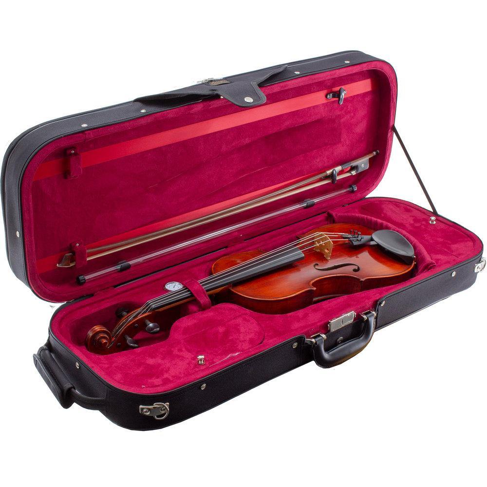 Handmade, to exacting standards. Pirastro strings and an excellent brazilwood bow. Oblong case with rucksack straps.